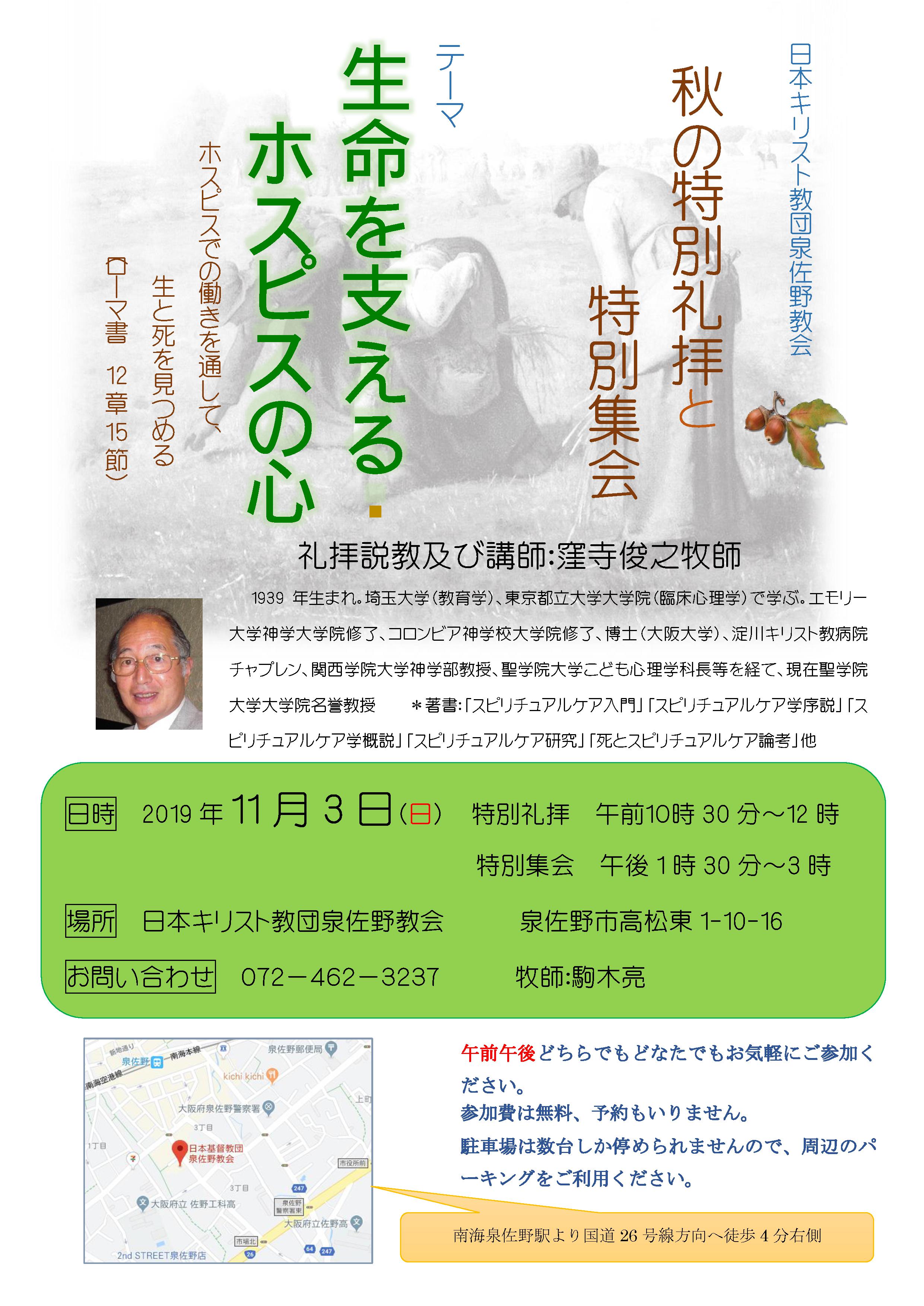 終末期について共に考える礼拝と集会です。キリスト者でない方も参加できます。午前午後どちらでも是非ご参加ください。